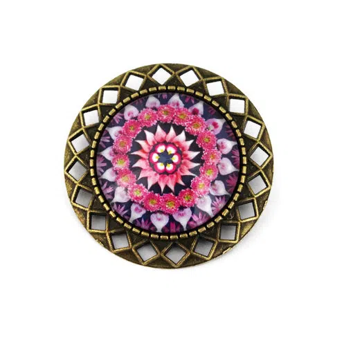 Brosa realizata din cabochon de sticla, model floral si baza brosa, metalica, cu diametrul de 37 mm.