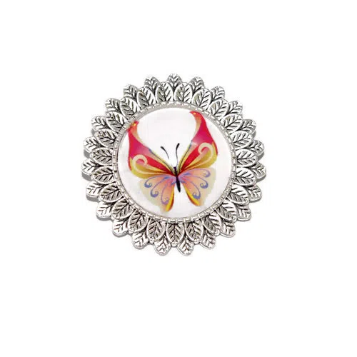 Brosa realizata din cabochon de sticla, model fluture rosu&galben si baza brosa, metalica, argintie, floarea soarelui, cu diametrul de 3 cm.