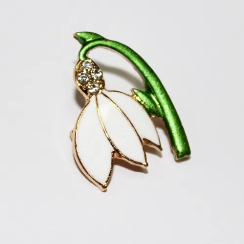 Brosa ghiocel, metalica - aurie. Culoare - alb & verde. Dimensiune - 2.4 x 1.8 cm.
