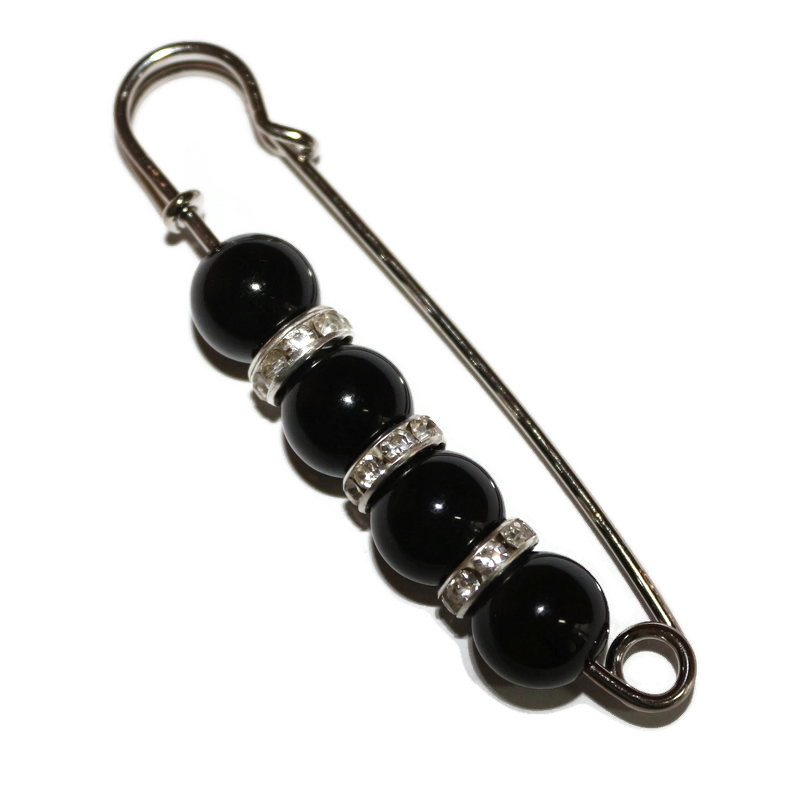Bijuteria este o brosa tip ac, realizata din baza de brosa argintie si margele acrilice sferice, negre, cu accesorii metalice.