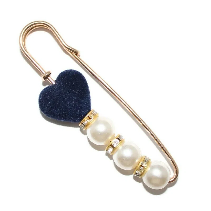 Brosa tip agrafa cu perle ivory si inimioara din material textil.
