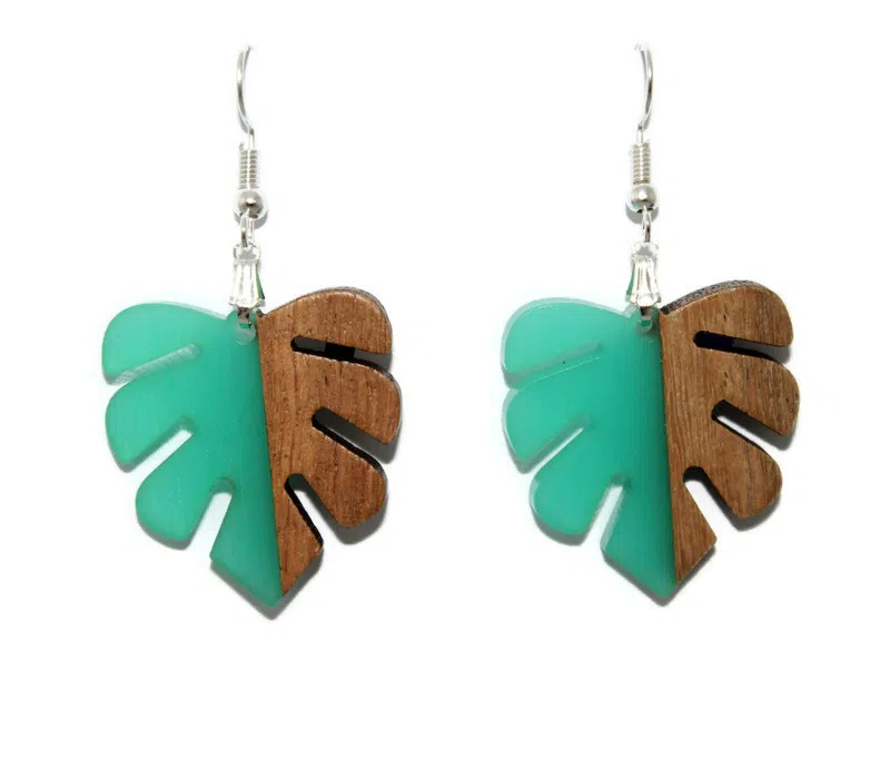 Cercei frunza din lemn cu rasina verde, cu lugimea de 5 cm.