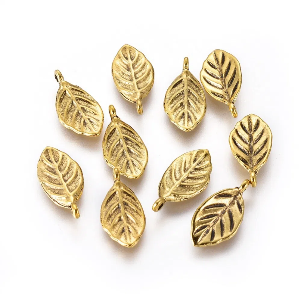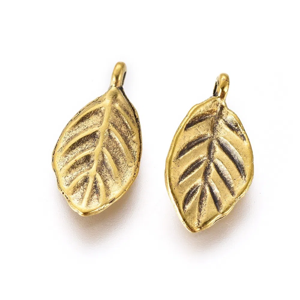 Charm frunzulita, auriu, dimensiune 8x16 mm, grosime - 1 mm, diametru gaura - 1.2 mm.