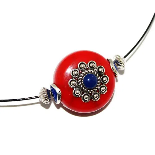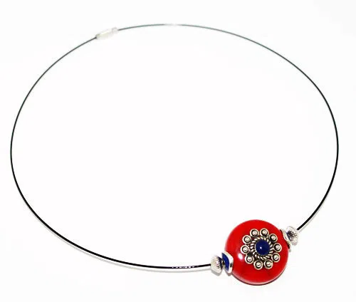 Colierul este realizat pe baza siliconata, neagra, cu diametrul de 16 cm si accesorizat cu pandantiv rasina, floare rosie.