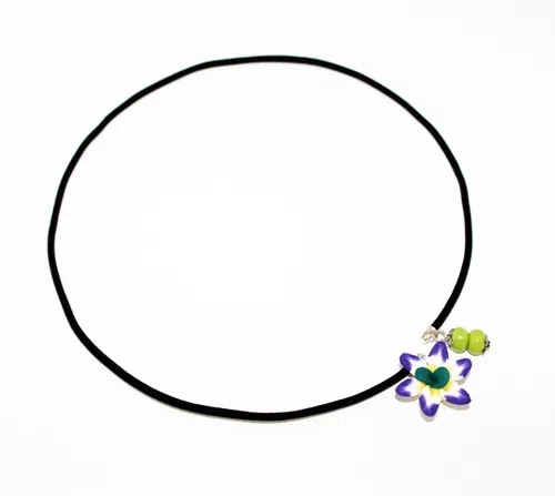 Colierul este realizat din sarma de memorie pentru coliere, "imbracata" cu snur din catifea si are la capete un pandantiv floare din fimo si un pandantiv creat din rondele de sticla verde mar, cu accesorii metalice argintii.