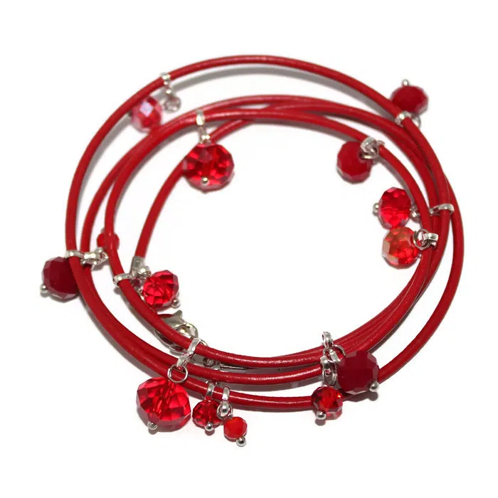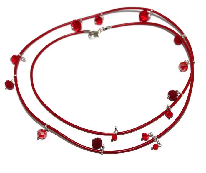 Colierul este realizat pe snur din piele, rosu de 2 mm, accesorizat cu margele din sticla, abacus, rosii, diverse dimensiuni. Colierul poate fi purtat la gat, gen choker sau rulat la mana, gen bratara. Lungime colier - 76 cm.