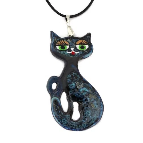 Colier unicat cu pandantiv din ceramica "Galactic Cat" realizat pe snur faux suede, cu lungimea de 42 cm, prevazut cu inchizatoare tip carabina si lant de prelungire de 5 cm, grosime de 2 mm.