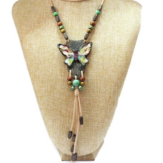Colier unicat cu pandantiv din ceramicat "Romantic Butterfly" realizat pe snur din piele, cu lungimea de 68 cm.