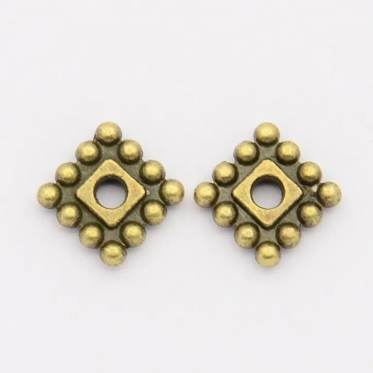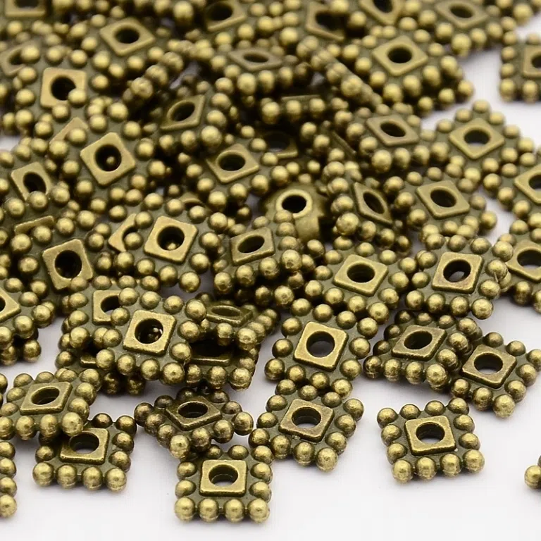 Distantier patrat, bronz antic, dimensiune - 7 x 7 mm, grosime - 2 mm, diametru gaura - 2 mm.
