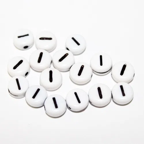 Margele acrilice cu litera "I". Culoare - alb. Diametrul - 6 mm, grosime - 3.5 mm, diametru gaura - 0.5 mm.