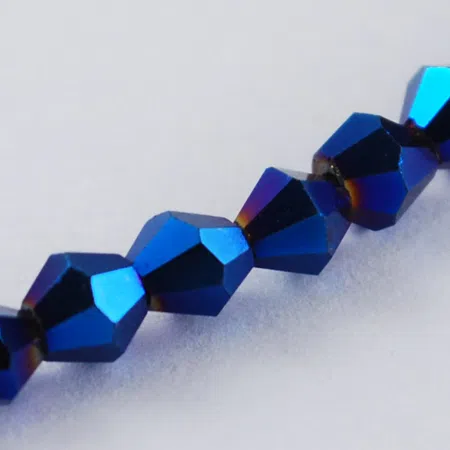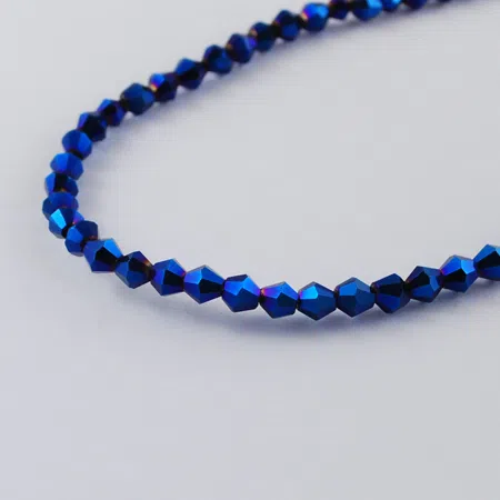 Margele de sticla biconice. Culoare - albastru electroplacat. Dimensiune - 4 mm. Diametru gaura - 0.4 mm.