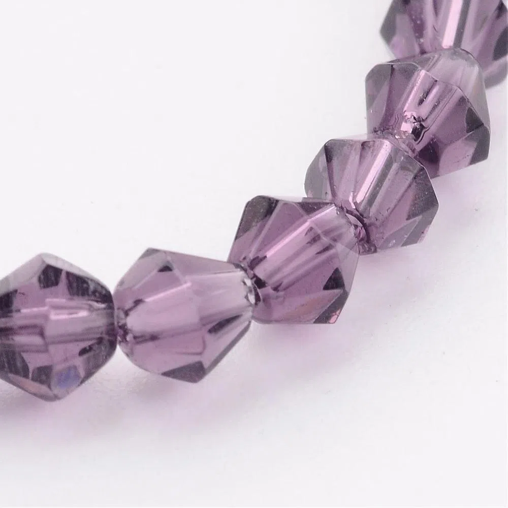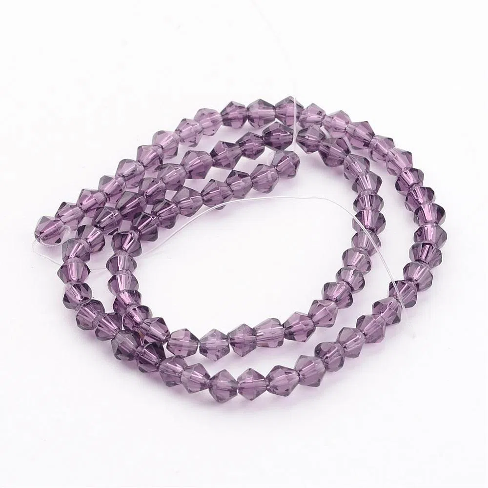 Margele de sticla biconice. Culoare - mov. Dimensiune - 4 mm. Diametru gaura - 0.4 mm.