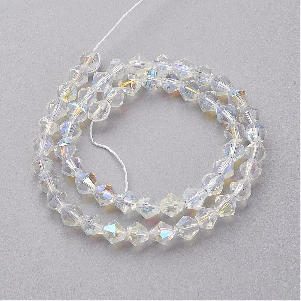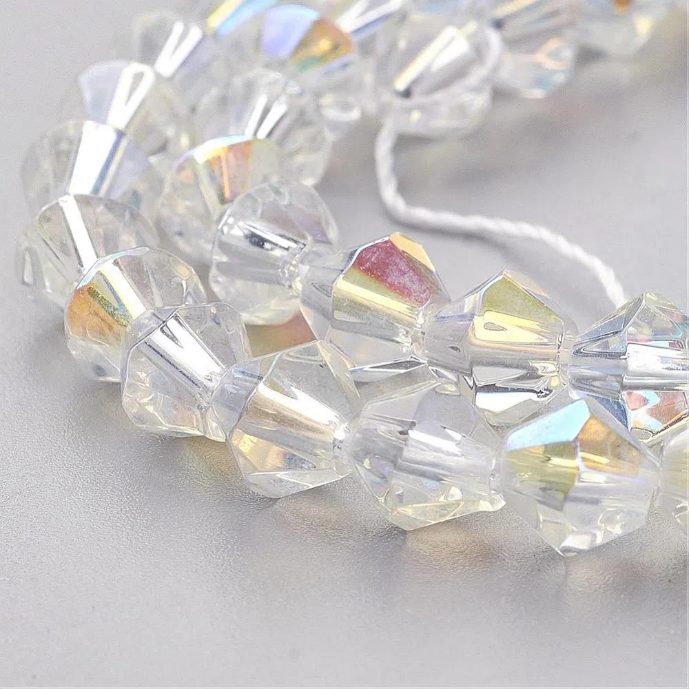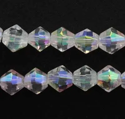 Margele de sticla biconice, culoare - alb transparent cu efect AB, dimensiune 6 mm.