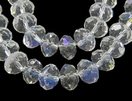 Margele de sticla fatetate, culoare - alb transparent cu efect AB (aurora boreala), diametru - 8 mm, grosime - 6 mm, diametru gaura - 1 mm.