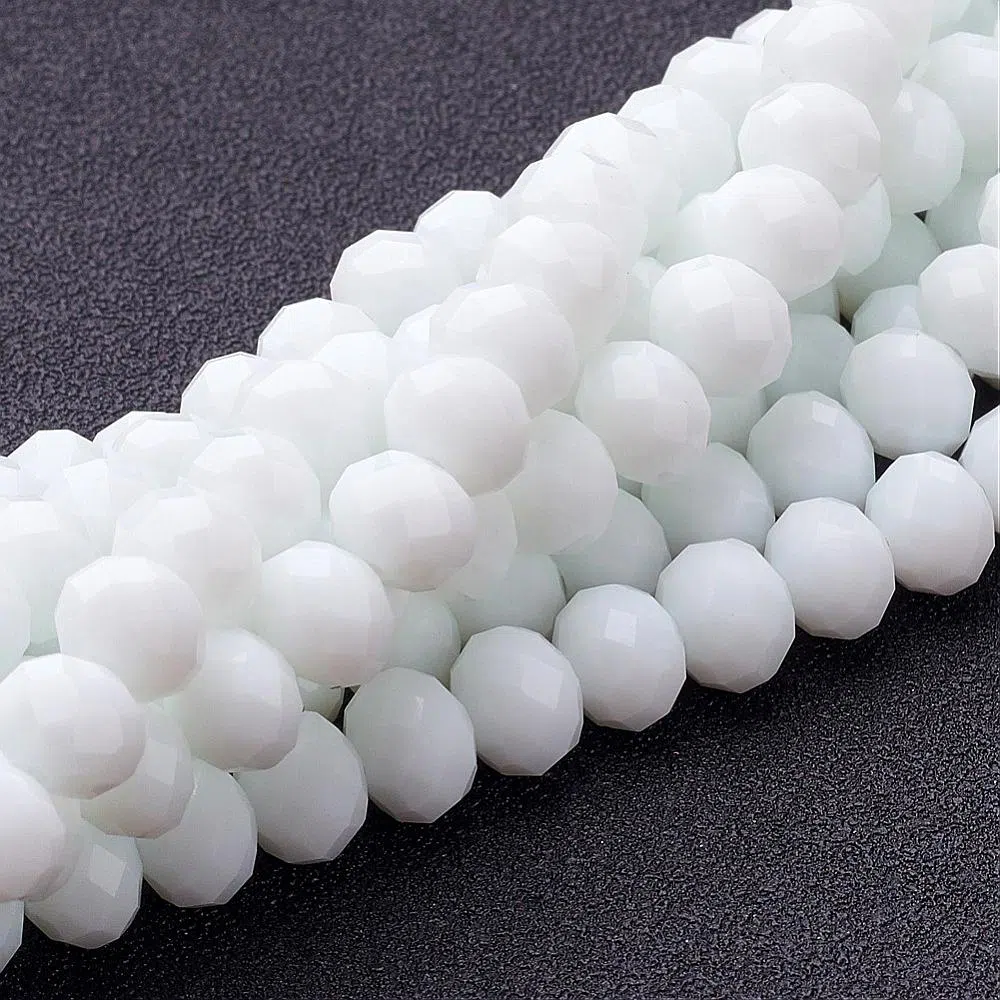 Margele de sticla fatetate, abacus, culoare - alb mat, diametru - 8 mm, grosime - 6 mm, diametru gaura - 1 mm.