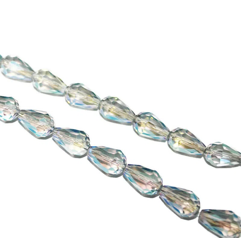 Margele de sticla fatetate, in forma de lacrima. Dimensiune - 16 x 10 mm, diametru gaura - 1 mm. Culoare - azur cu efect AB.