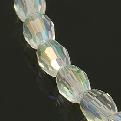 Margele de sticla ovale fatetate, culoare - alb cu efect AB, dimensiune 6 x 4 mm, diametru gaura - 1 mm.