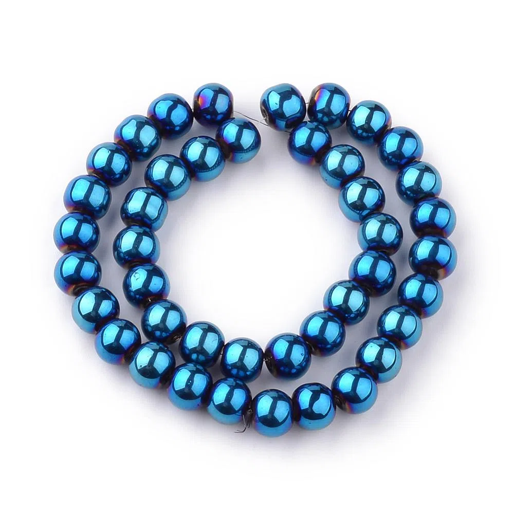 Margele de sticla sferice, culoare - albastru electroplacat, dimensiune - 8 mm, diametru gaura - 1.5 mm.