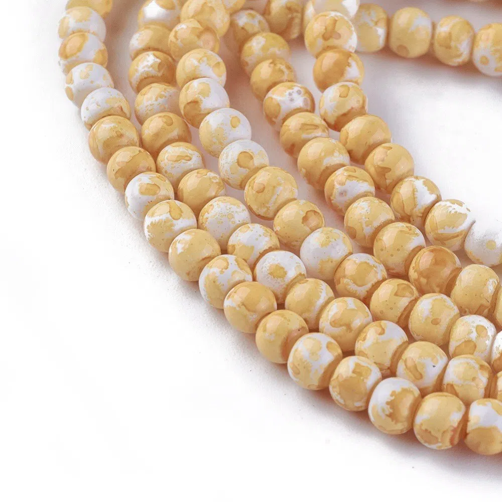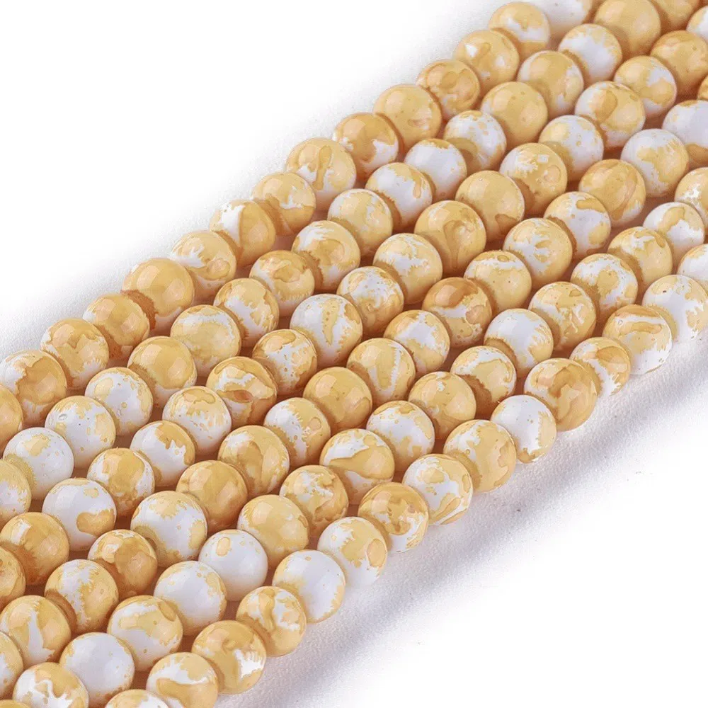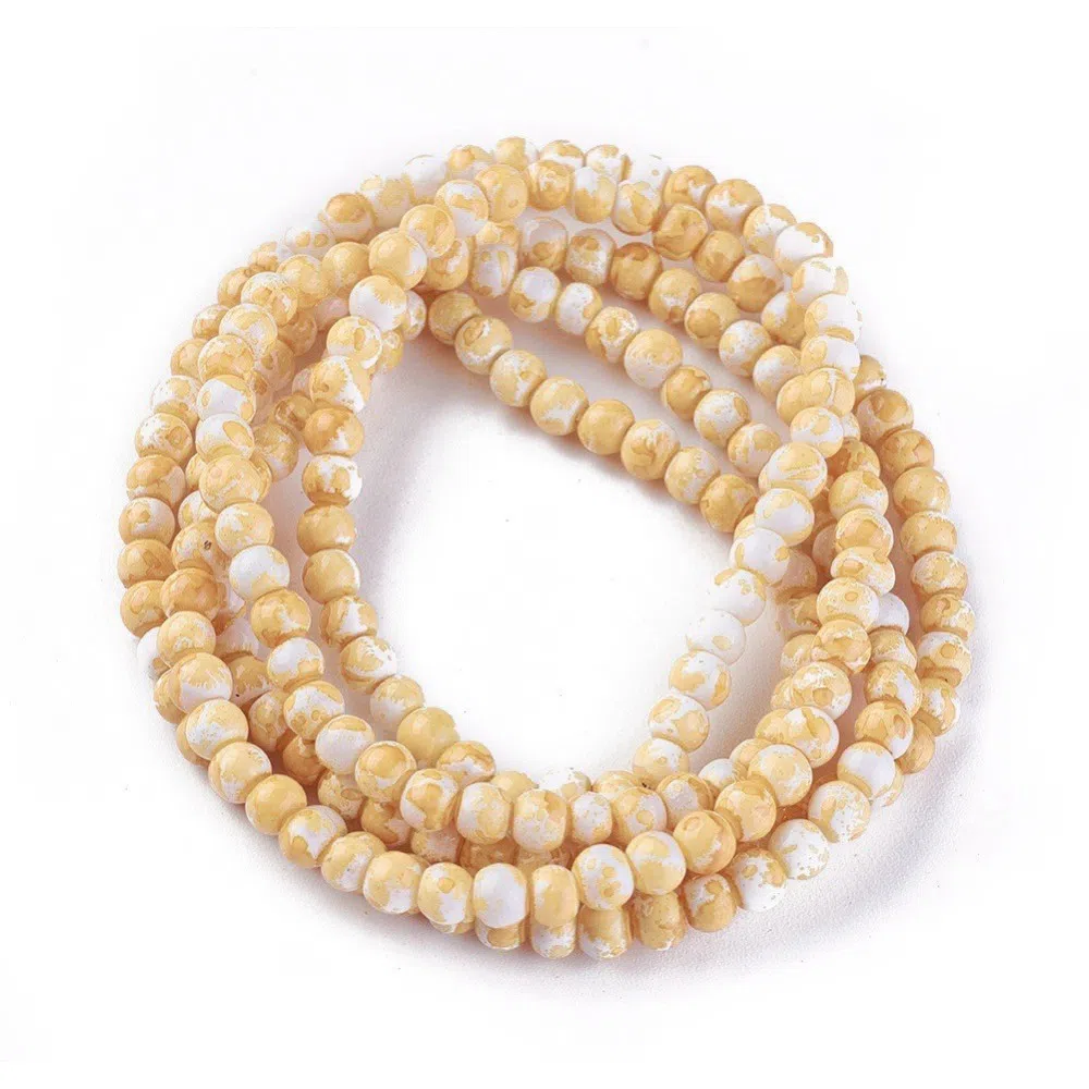 Margele de sticla sferice, pistruiate, culoare - galben mustar si alb, dimensiune - 4 mm, diametru gaura - 0.6 mm.