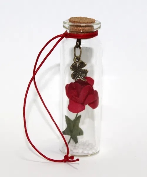 Pandantiv sticluta cu trandafir rosu si charm trifoi cu 4 foi din bronz, in interior. Dimensiune sticluta - 7.3 x 2.2 cm. Pandantivul este prevazut cu dop de pluta, si ata cerata rosie.
