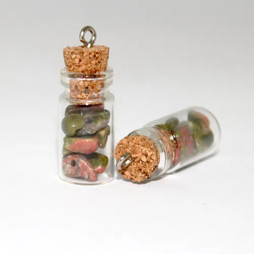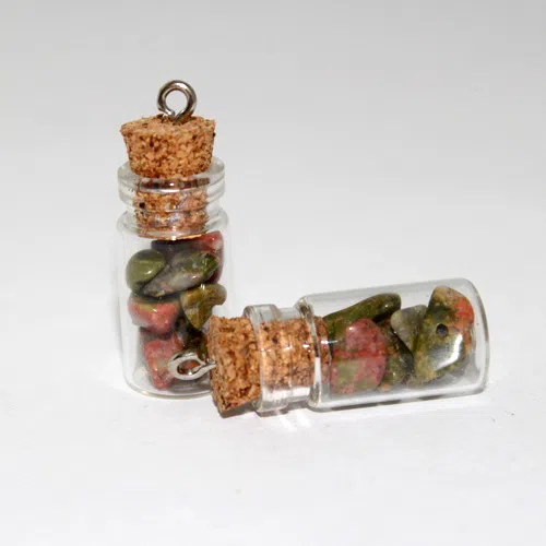 Pandantiv sticluta cu chipsuri de unakit, dimensiune sticluta - 30 x 11 mm. Pandantivul este prevazut cu dop de pluta, si agatatoare argintiu inchis. Pretul afisat este pentru 1 pandantiv.
