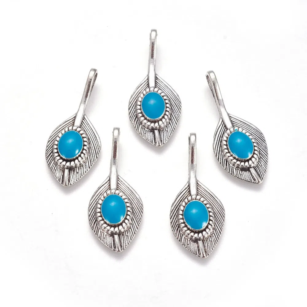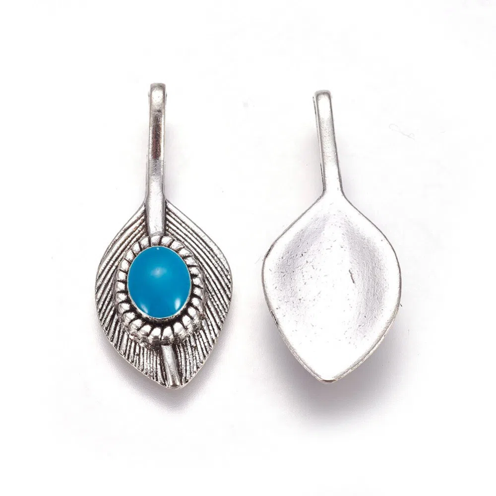 Pandantiv frunza cu cabochon turcoaz, metalic, argintiu antic.