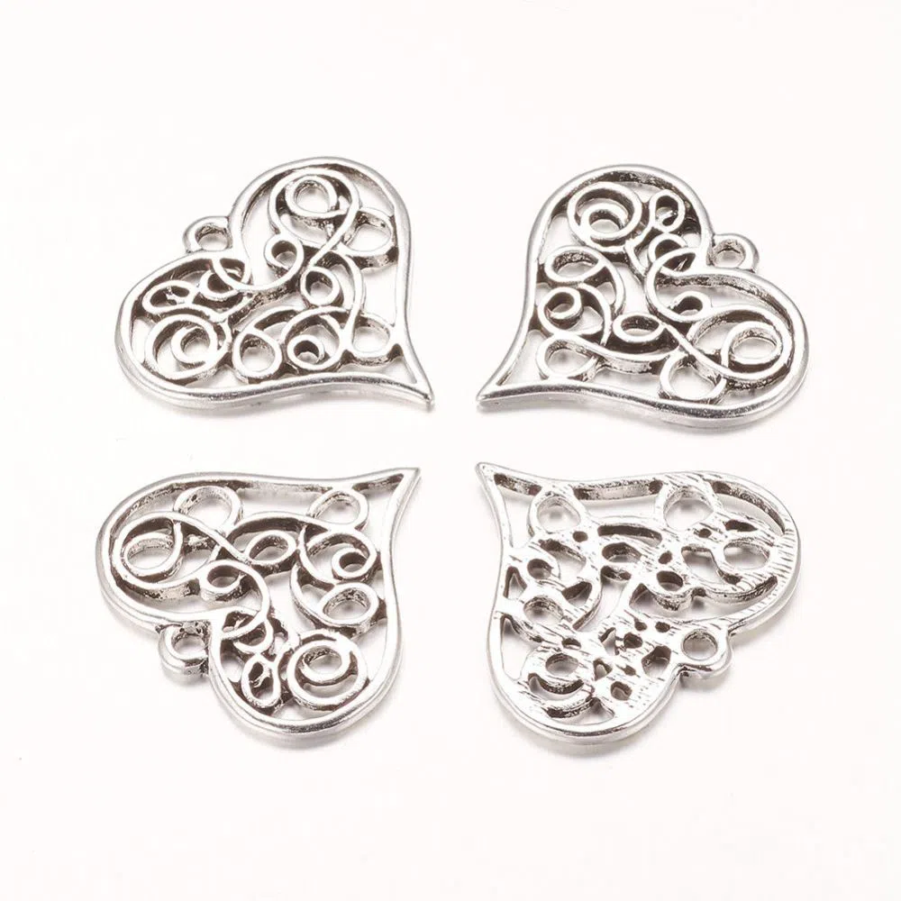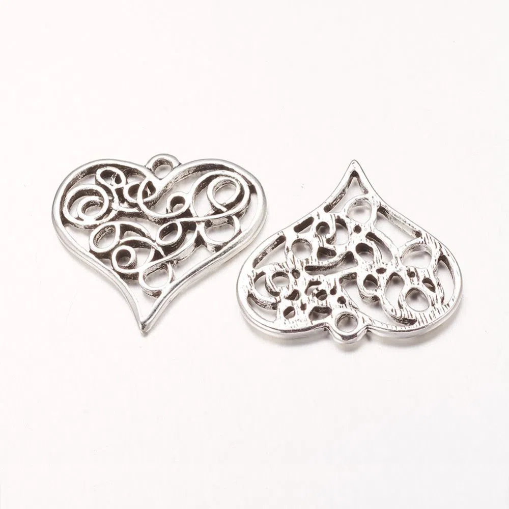 Pandantiv metalic in forma de inima filigranata, culoare argintiu antic.