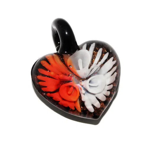 Pandantiv din sticla tip murano, inima cu floare venetiana alb&orange, dimensiune 4 x 3.2 cm, grosime - 15 mm.