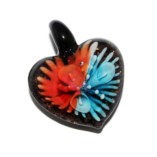 Pandantiv din sticla tip murano, inima cu floare venetiana bleu&orange, dimensiune 4 x 3.2 cm, grosime - 15 mm.