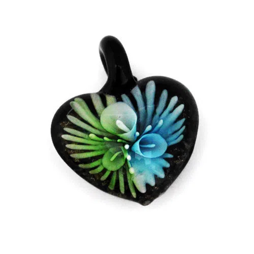 Pandantiv din sticla tip murano, inima cu floare venetiana bleu&verde, dimensiune 4 x 3.2 cm, grosime - 15 mm.