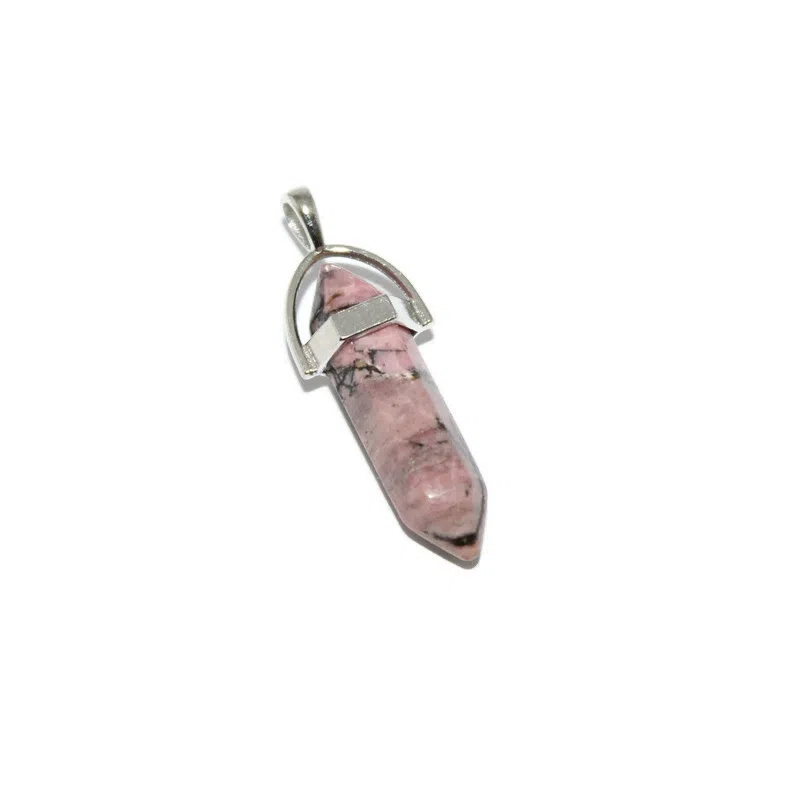 Pandantiv - varf de rodonit. Dimensiune totala 4 x 0.9 cm, dimensiune piatra - 3 x 0.9 cm. Diametru gaura agatatoare - 4.5 x 3 mm .
