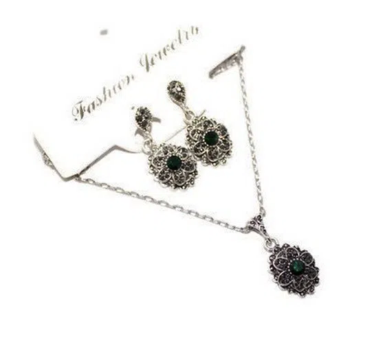 Set bijuterii "Rubinia Flower Green" este format din colier si cercei, cu marcasite si cabochoane verzi.