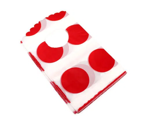 Set pungi de plastic, pentru ambalat, culoare -albe cu buline rosii.